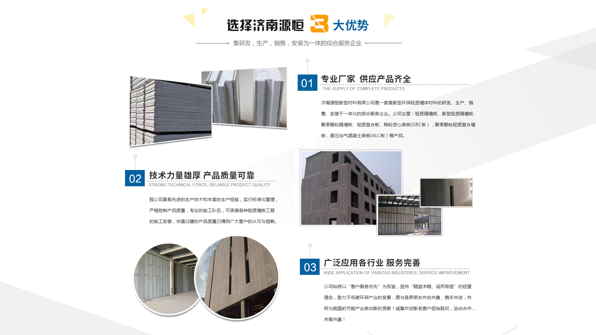 濟南源恒新型材料有限公司坐落于美麗的泉城濟南,是集新型環(huán)保輕質墻體材料的研發(fā)、生產、銷售、安裝于一體化的綜合服務企業。我公司具有的生產技術和豐富的生產經驗,為您提供輕質隔墻板、新型輕質隔墻板、聚苯顆粒隔墻板、輕質復合板、陶粒空心條板(GRC板),聚苯顆粒輕質復合墻板,蒸壓加氣混凝土條板(ALC板)等產品,本公司有專的施工隊伍,可承接各種輕質墻板工程的施工安裝。輕質隔墻板是國家推廣使用的新型輕質、綠色無害建材,是墻改節(jié)能政策大力扶持的環(huán)保節(jié)能產品,是發(fā)達國家普遍采用的新型墻體材料。濟南源恒新型材料有限公司實行標準化管理,嚴格控制產品質量,依靠過硬的產品質量已得到廣大客戶的認可與信賴。公司產品遍布各大城市,與國內多家客戶建立了良好的合作關系。公司始終以“客戶服務優(yōu)先”為宗旨,堅持“精益求精、誠而有信”的經營理念,致力于低碳環(huán)保產業的發(fā)展,愿與各界朋友共創共贏,攜手共進,共同為我國的節(jié)能產業做出新的...